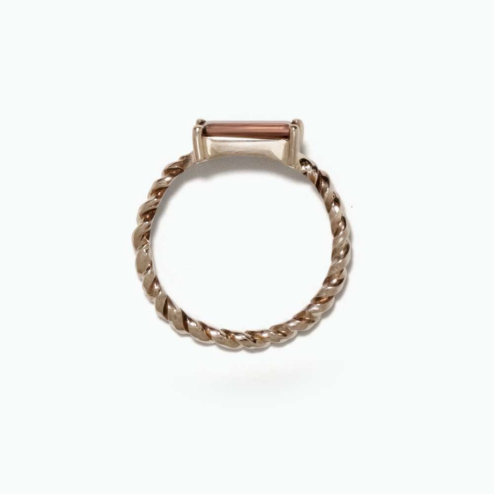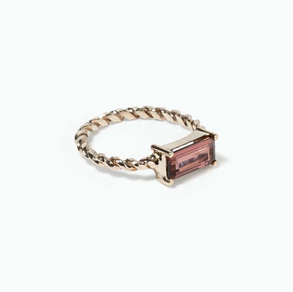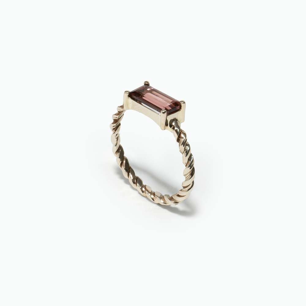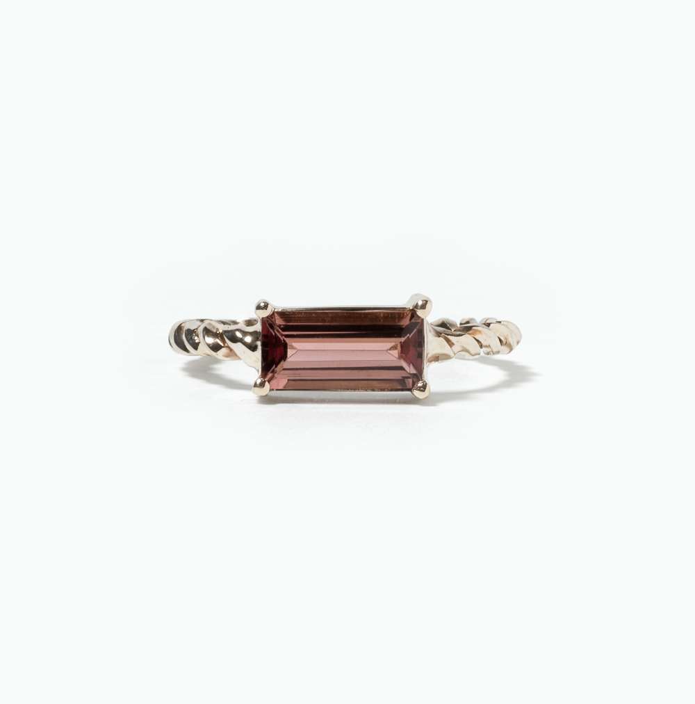 Bague fine en fil d’or gris torsadé et sertie d’une Tourmaline rose taille baguette de 6x8mm.