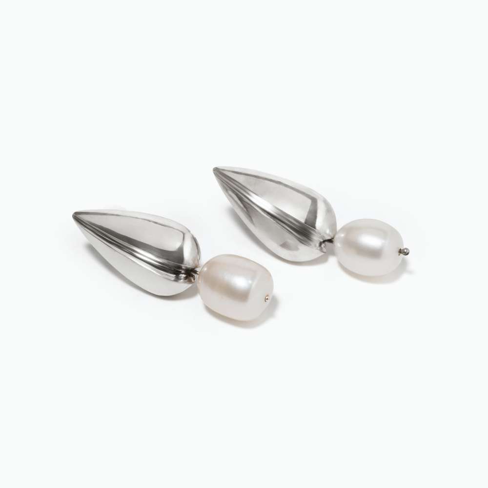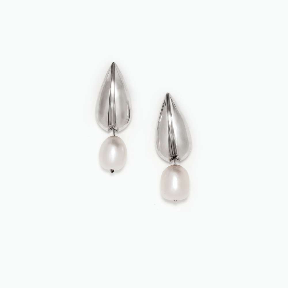 Boucles d’oreilles en argent massif en forme de goute fendue et habillée d’une perle baroque.