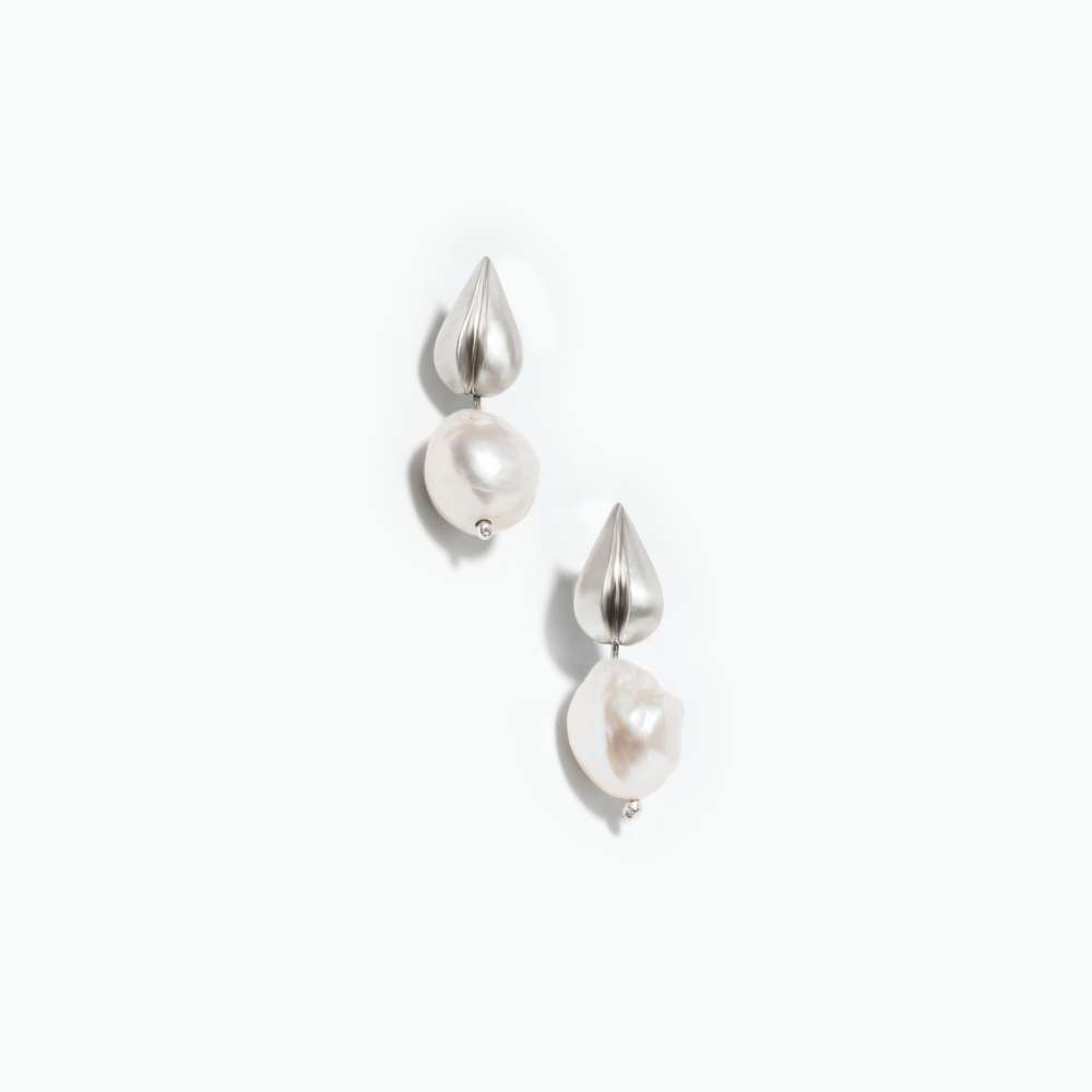 Boucles d’oreilles en argent massif en forme de goute fendue et habillées d’une perle baroque.