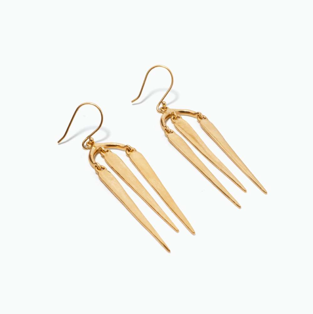 Boucles d’oreilles en argent massif plaquées à l’or fin composées d’un élément en ogive depuis lequel sont suspendues trois longues goutes de métal.