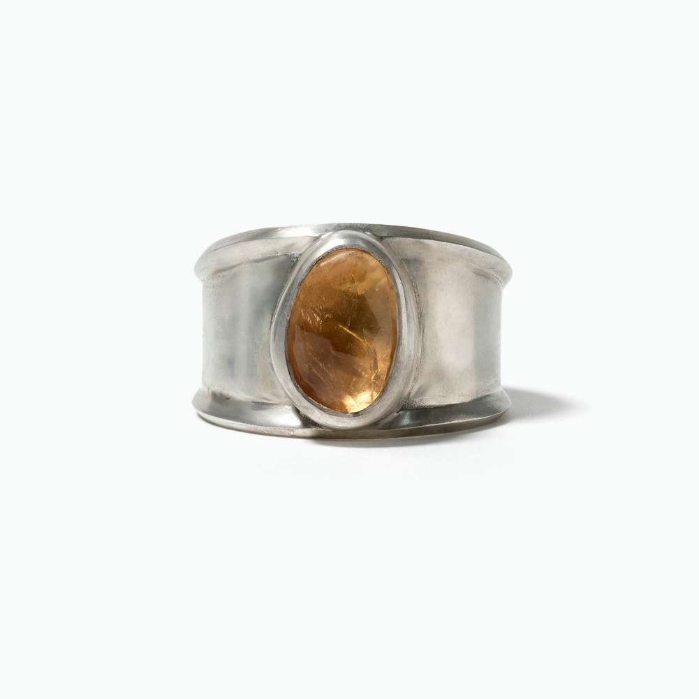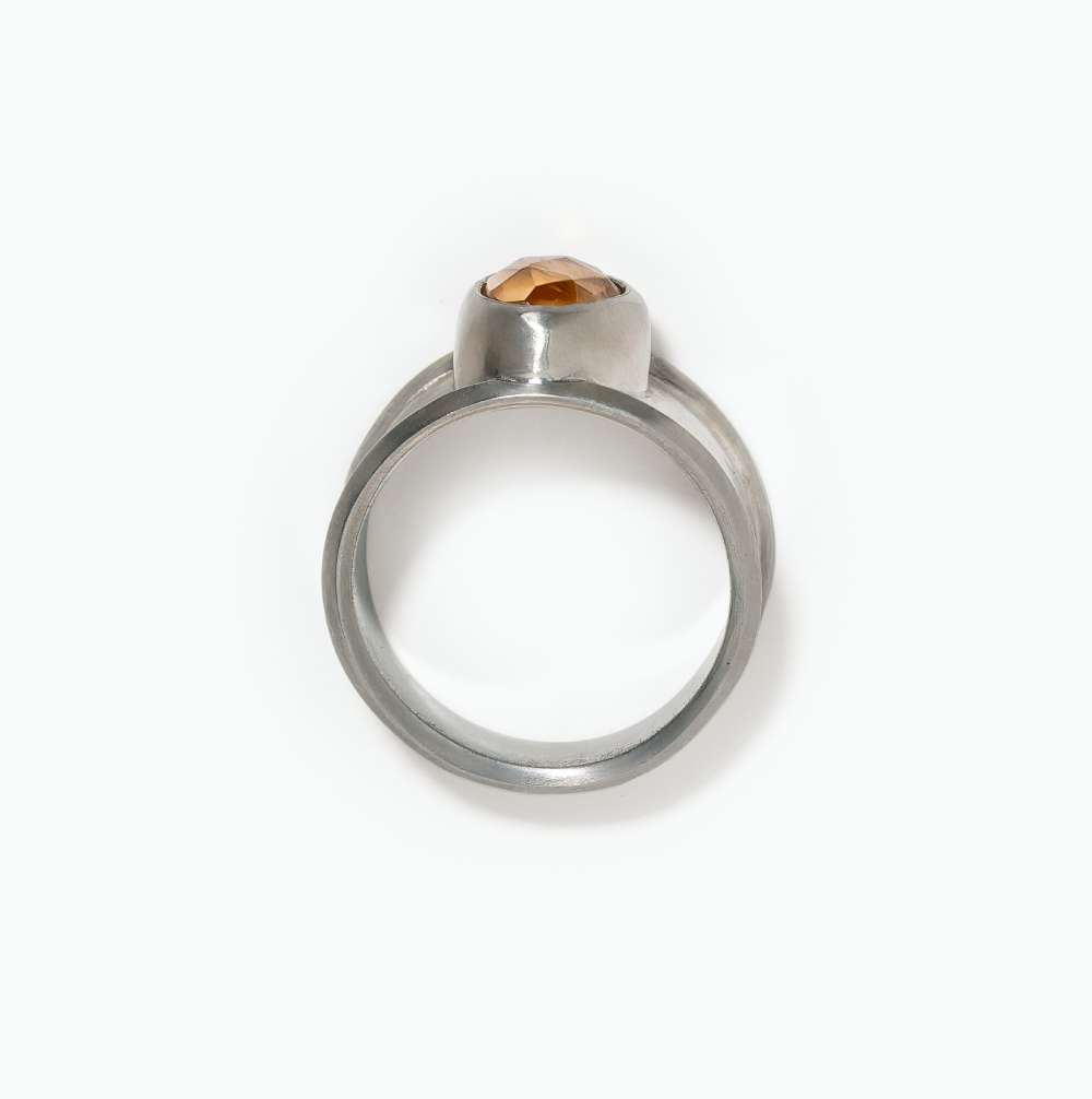 Chevalière en argent massif ceinte de deux fils couteau et sertie clos d’une Citrine.