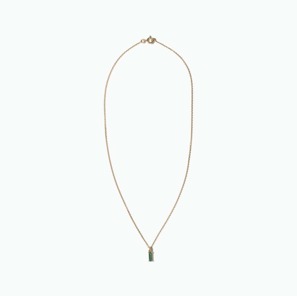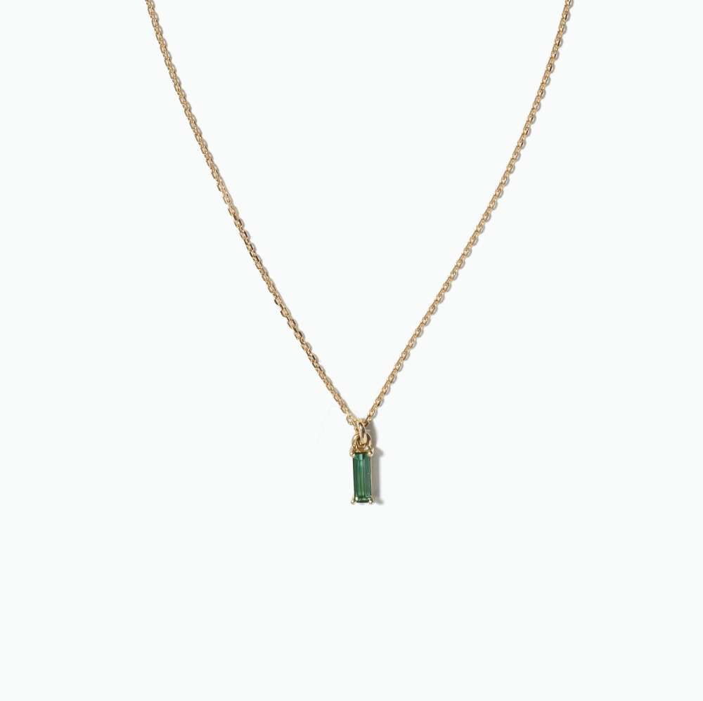 Collier en or serti d’une Tourmaline verte taille baguette de 3x4mm, montée sur une chaîne en or forçat diamantée d’une épaisseur de 1,2mm.