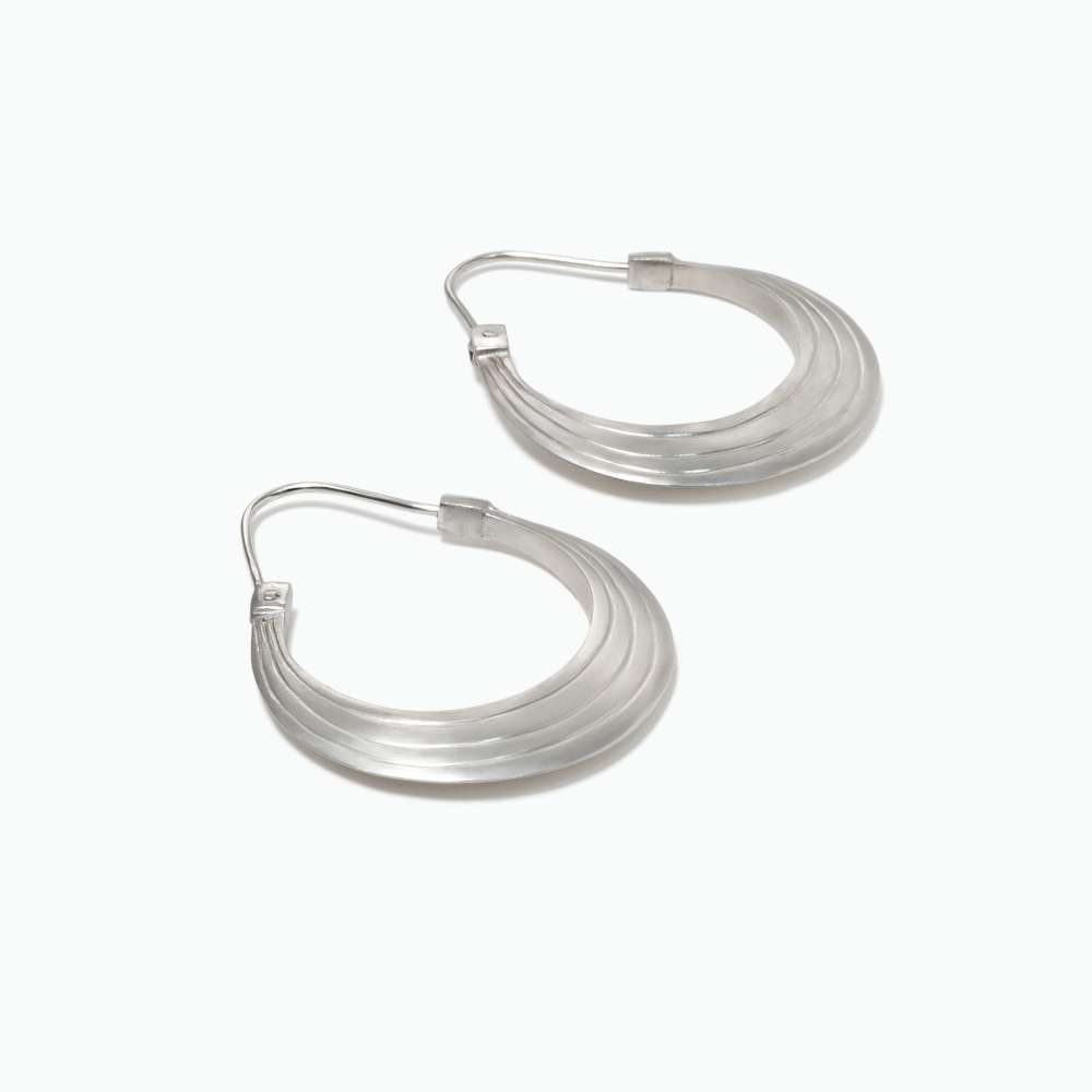 Créoles en argent massif d’un diamètre extérieur de 28mm habillées de trois lignes gravées.